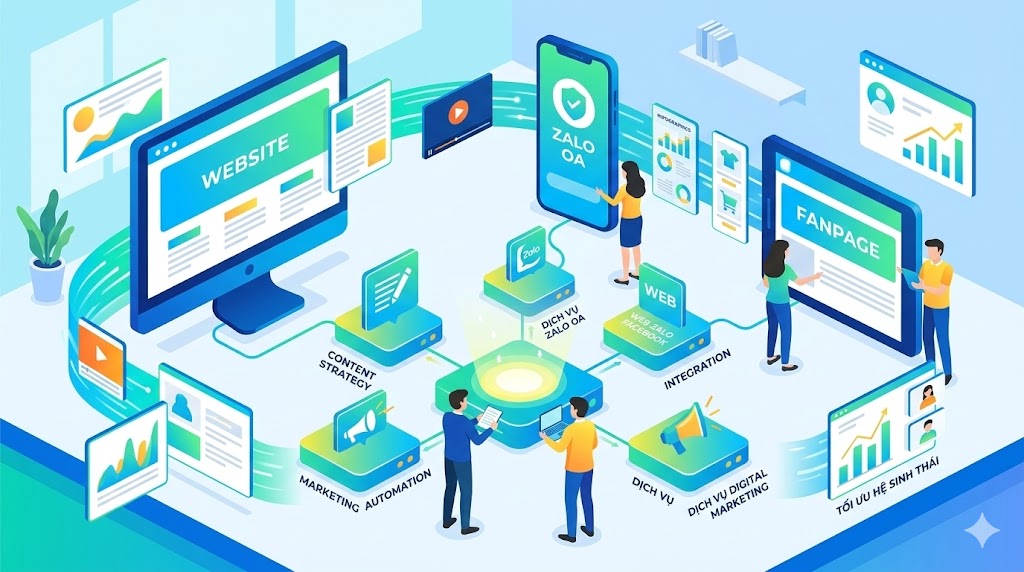 - Marketing Automation: Áp dụng công nghệ tự động hóa để duy trì sự tương tác 24/7, giúp Fanpage và Zalo luôn hoạt động hiệu quả mà không cần tốn quá nhiều nhân lực vận hành.