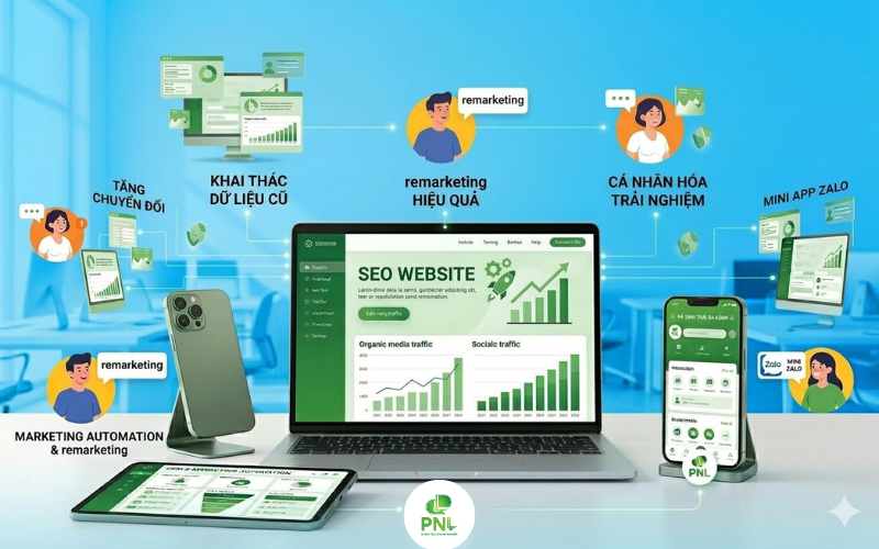 Website chỉ là bước khởi đầu. PNL hỗ trợ doanh nghiệp tối ưu hệ sinh thái web zalo facebook và triển khai marketing automation. Chúng tôi giúp bạn kết nối Website với hệ thống CRM, Zalo OA và các công cụ quản trị khác để tạo thành một bộ máy vận hành tự động, sẵn sàng cho việc mở rộng quy mô lên gấp nhiều lần.